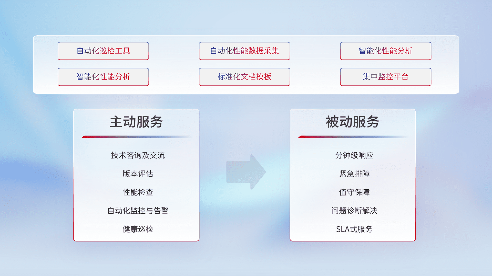 智能化工具和标准化文档,,保障服务质量,,,提供主动服务(包含技术咨询、、、、版本评估、、、、性能检查、、、、自动化监控与告警、、健康巡检)和被动服务包含(分钟级响应、、、、紧急排障、、、、值守保障、、问题诊断解决、、、SLA服务)。。。